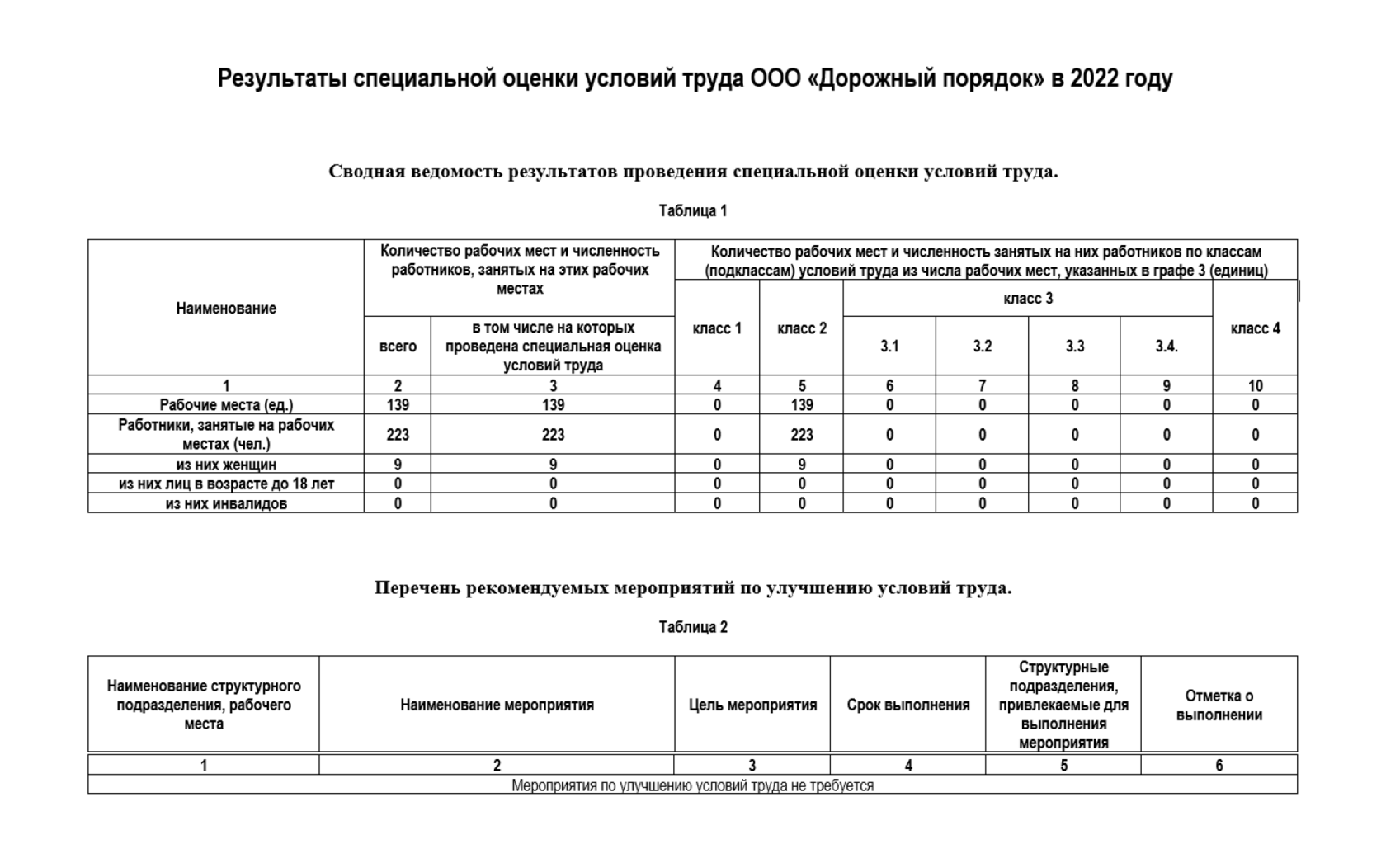 Результаты специальной оценки условий труда ООО «Дорожный порядок» в 2022 году